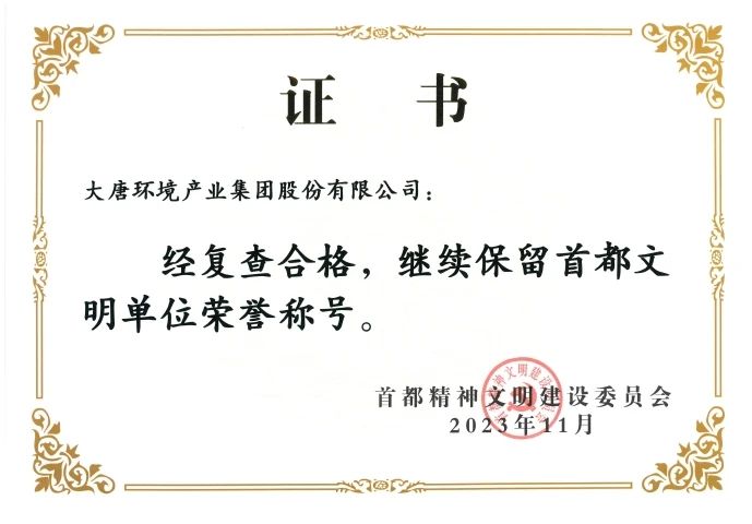 本網訊?近日,首都精神文明建設委員會頒發(fā)了“首都文明單位”復查合格證書,大唐環(huán)境產業(yè)集團股份有限公司繼2015年獲得“首都文明單位”稱號后,順利通過復查,連續(xù)保持9年“首都文明單位”稱號。