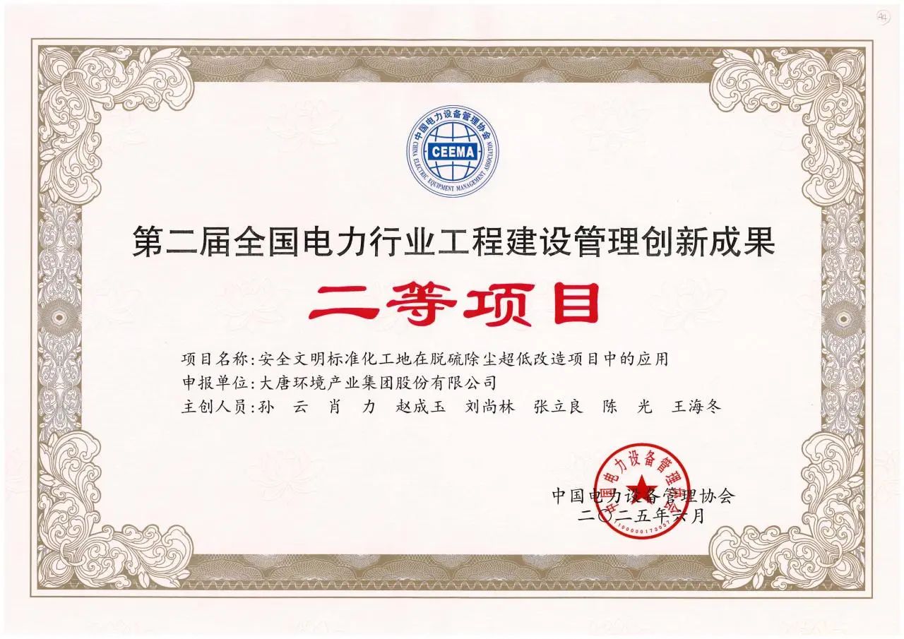 本網訊?近日,中國電力設備管理協會公布第二屆全國電力行業(yè)工程建設管理創(chuàng)新成果評選結果。大唐環(huán)境環(huán)保分公司雞西項目部申報的《安全文明標準化工地在脫硫除塵超低改造項目中的應用》項目,憑借其在安全管理實踐中的顯著成效,獲二等項目獎項。