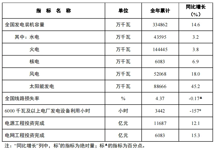 截至12月底,全國累計(jì)發(fā)電裝機(jī)容量約33.5億千瓦,同比增長14.6%。其中,太陽能發(fā)電裝機(jī)容量約8.9億千瓦,同比增長45.2%;風(fēng)電裝機(jī)容量約5.2億千瓦,同比增長18.0%。