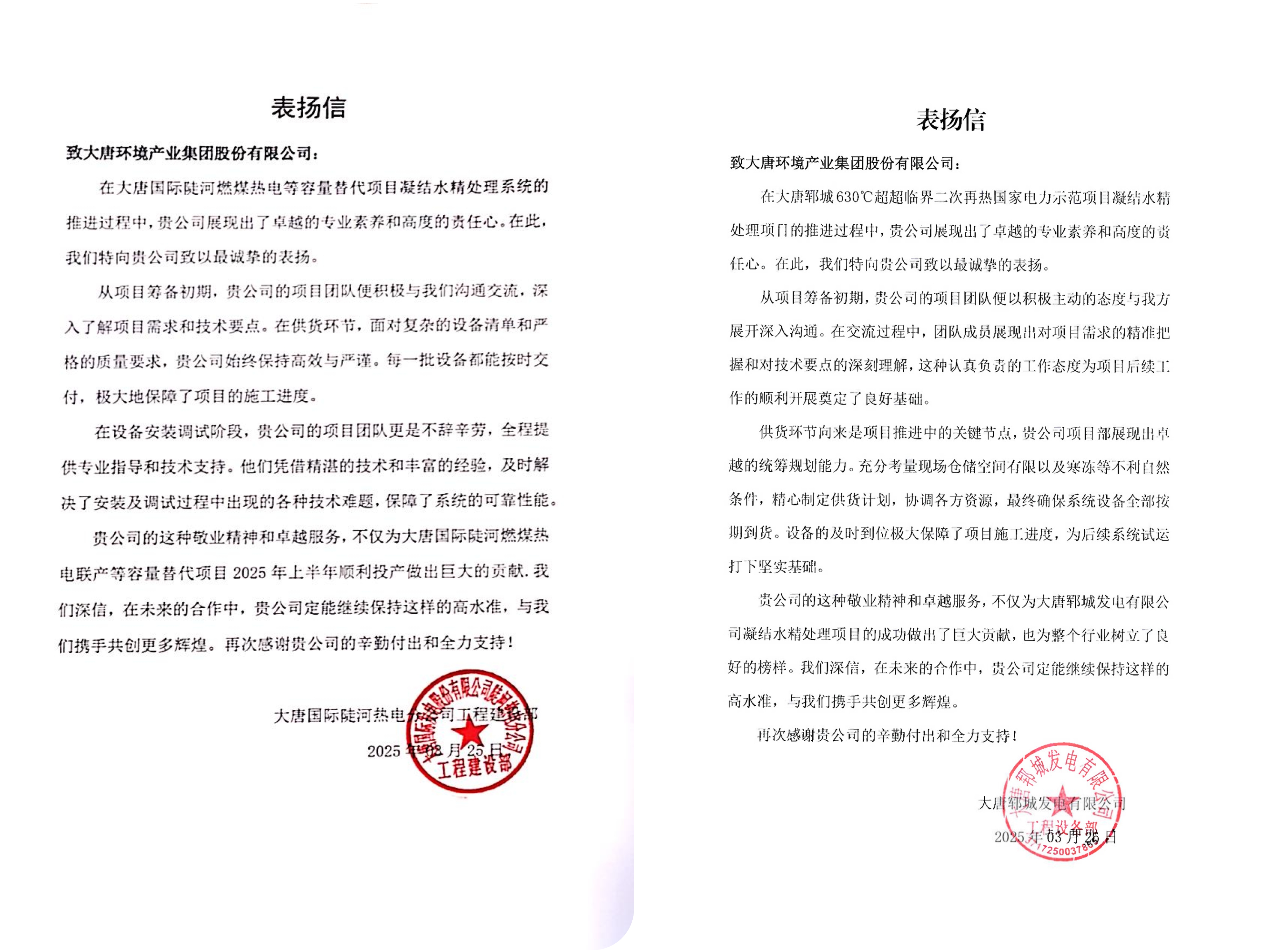 本網(wǎng)訊?近日,水處理事業(yè)部憑借在陡河項(xiàng)目與鄆城項(xiàng)目中的卓越表現(xiàn),接連收到兩封業(yè)主發(fā)來的表揚(yáng)信。信中對(duì)我方團(tuán)隊(duì)展現(xiàn)出的專業(yè)實(shí)力、服務(wù)精神及執(zhí)行效率給予高度評(píng)價(jià)。?