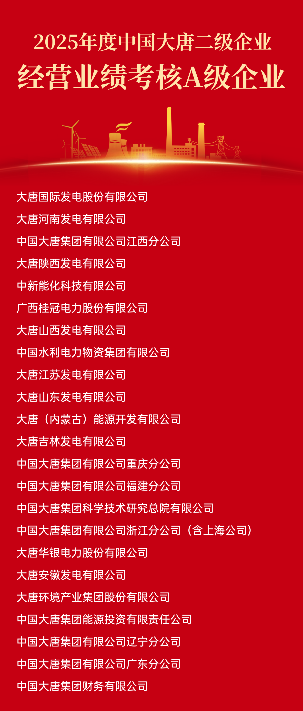 根據(jù)《中國(guó)大唐集團(tuán)二級(jí)企業(yè)及負(fù)責(zé)人經(jīng)營(yíng)業(yè)績(jī)考核辦法》及有關(guān)規(guī)定,2025年度二級(jí)企業(yè)經(jīng)營(yíng)業(yè)績(jī)考核結(jié)果已經(jīng)中國(guó)大唐2026年第1次董事長(zhǎng)專題會(huì)審議通過(guò)。A級(jí)企業(yè)名單如下: