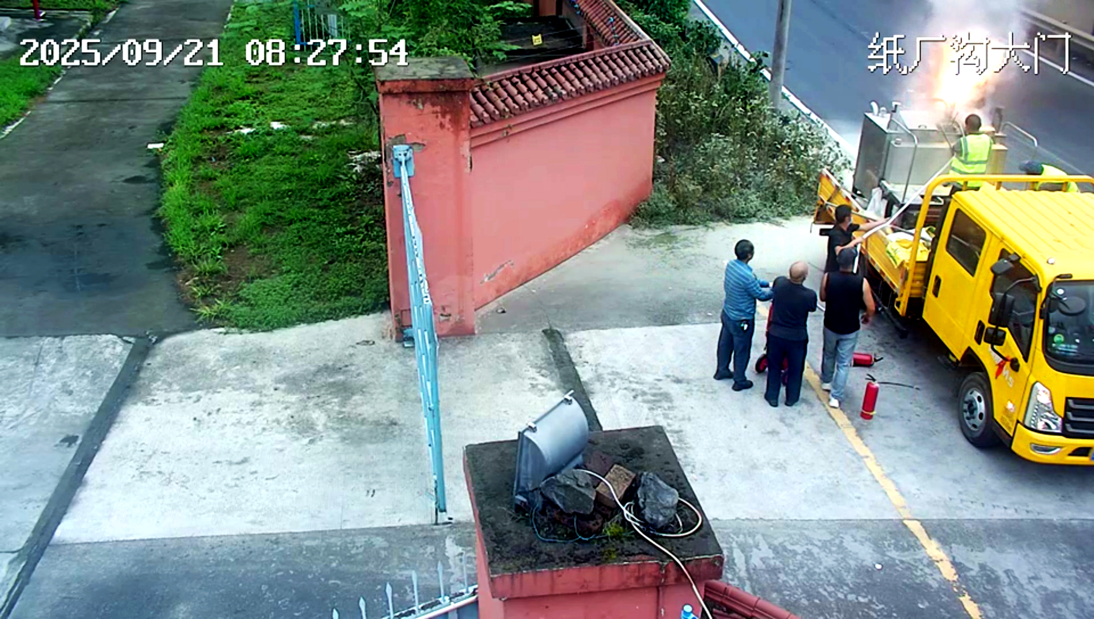 9月21日8點21分,該公司紙廠溝庫房大門前的馬路上,一輛正在執(zhí)行道路劃線作業(yè)的工程車突然燃起熊熊大火?;饎菅杆贁U大,情況異常危急,車輛作業(yè)人員立即向距離最近的紙廠溝庫房值班人員發(fā)出求救信號。