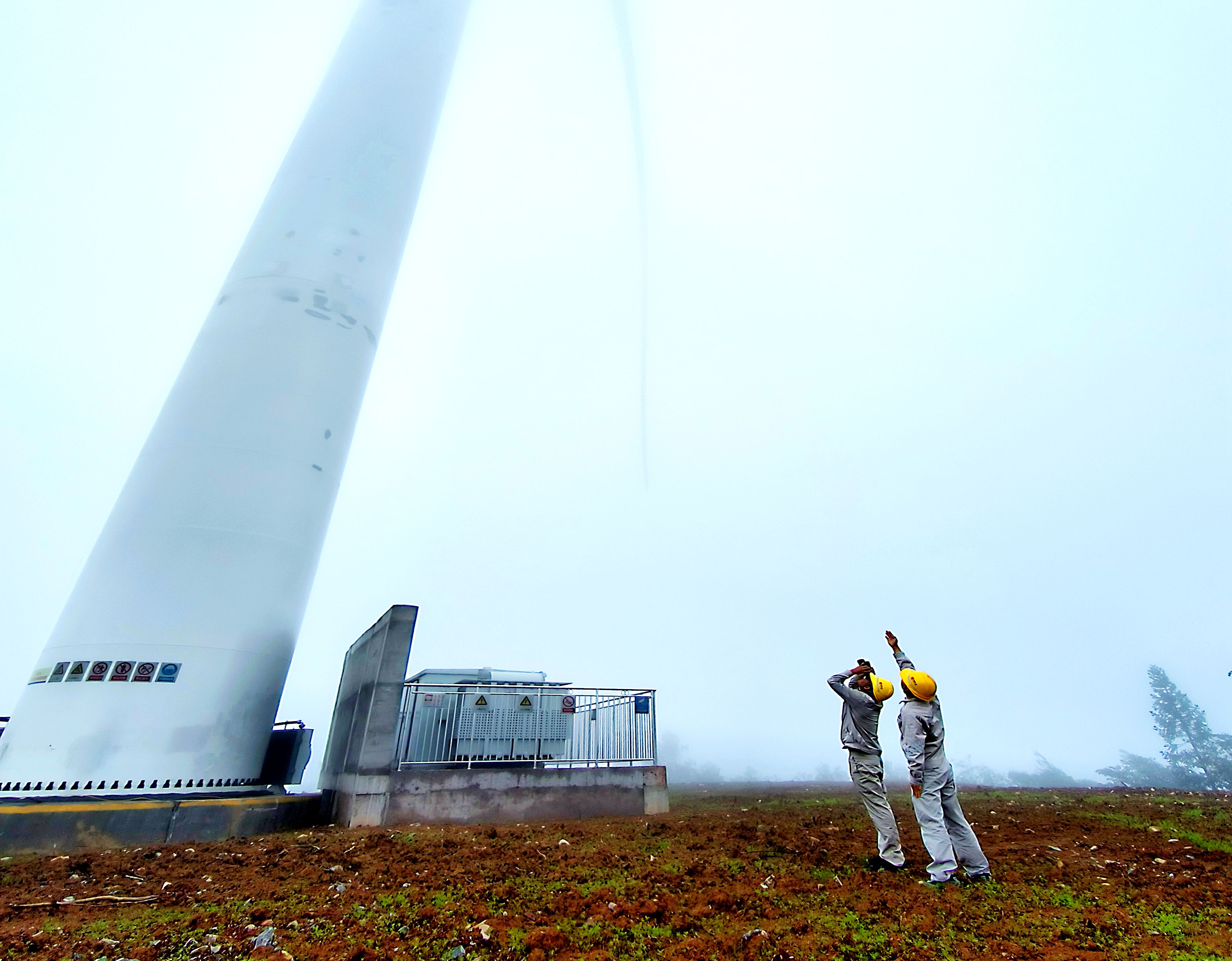 一陣山風(fēng)吹來,站在風(fēng)機(jī)塔下,幾個(gè)人都不由自主地緊了緊身上的大衣。云霧迅速流動(dòng)了起來,風(fēng)機(jī)的三個(gè)葉片和整個(gè)塔筒,慢慢從云霧中露出了“真容”。