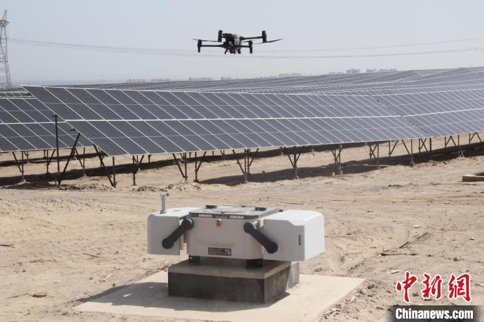 圖為5日,大唐第十四師昆玉市100萬千瓦光伏基地,無人機正在巡檢光伏組件運行情況。馬曉東 攝