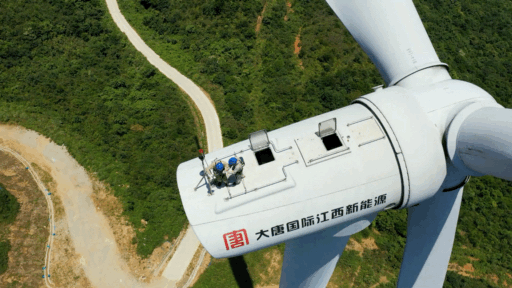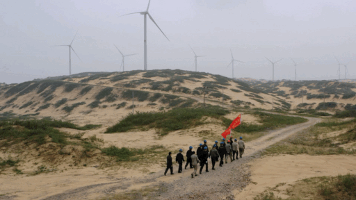 我招呼他們先把飯吃了,王鵬卻著急往風機輪轂里鉆,他說:“換完變槳電機再吃,另外兩個同事都還在里面等我呢?!蔽蚁颡M小的通道內(nèi)探了探頭,輪轂內(nèi)的溫度竟然比機艙內(nèi)的溫度還要高,測溫槍上顯示足足有50度。我看著三位大漢面面相覷,他們臉上豆大的汗珠在瑩瑩燈光的映照下愈發(fā)顯得耀眼。 1、2、3,1、2、3,他們憋紅著臉,合力將一百多斤的電機抬下,再用安全繩將電機掛好。更換完電機,他們癱坐在地上,笑著享用今天的午餐。青春就是如此:艱難困苦得以成長,汗流浹背得以成熟,理想信念得以團結。