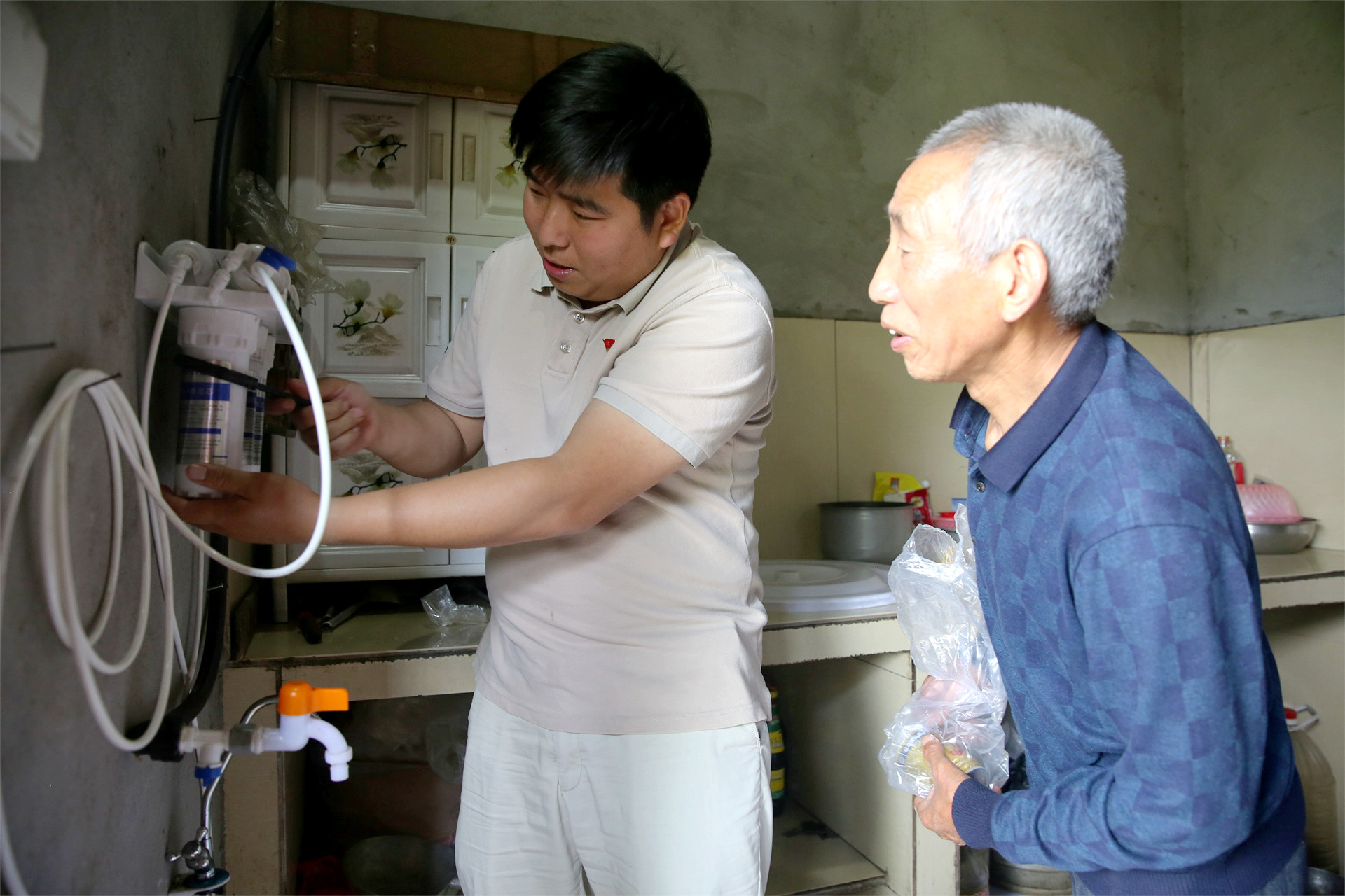 方名興了解到他們的“飲水難”情況后,用自己的錢第一時(shí)間在網(wǎng)上購(gòu)買了成套的家用凈水器,還即時(shí)提供“上門安裝”服務(wù)??粗鴥艋笄鍧嵉乃鬟M(jìn)水缸里,從此告別山平塘水,老劉他們激動(dòng)不已,逢人就說(shuō)“小方書(shū)記”是真正和群眾貼心、干實(shí)事的好干部。
