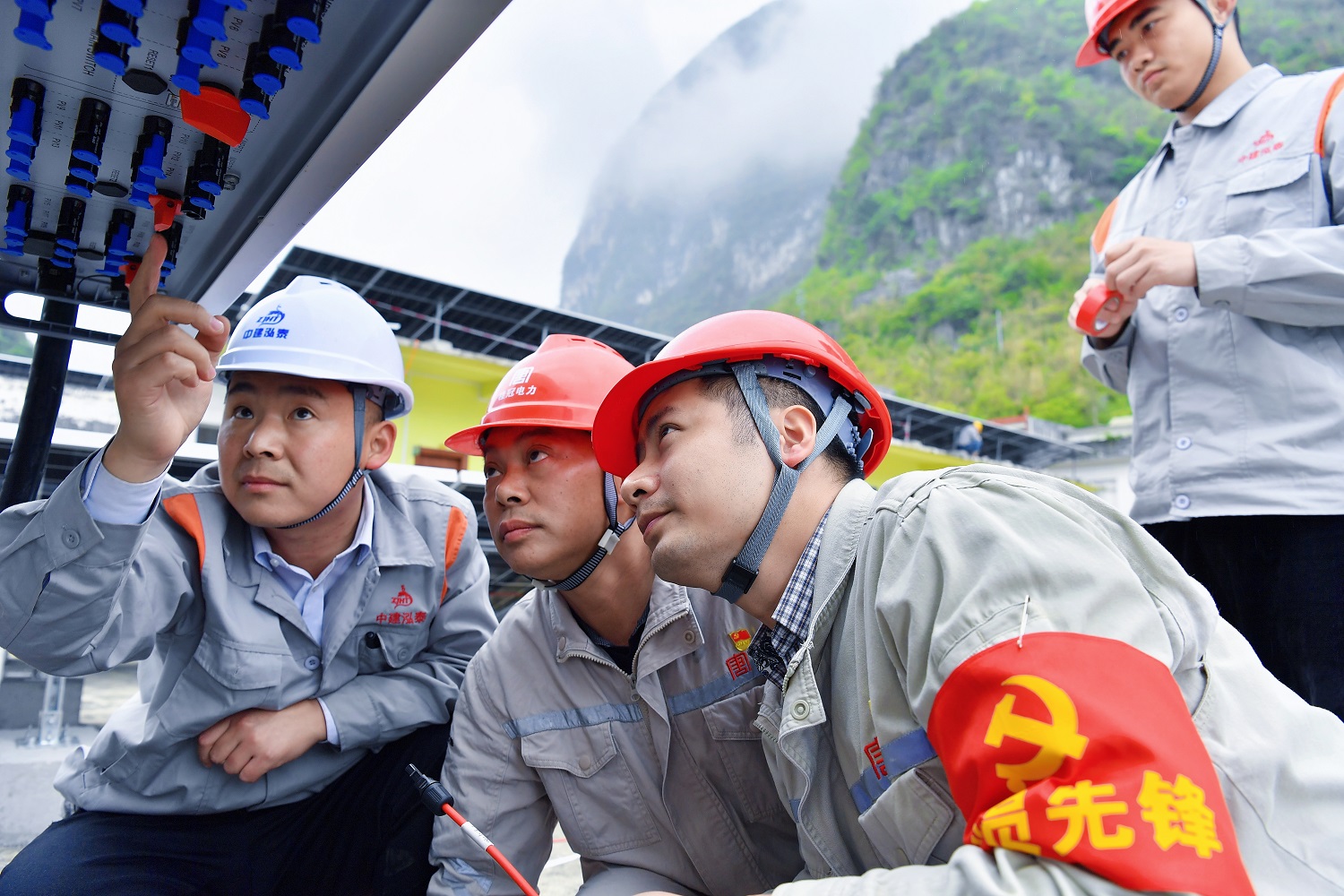 駐村工作隊(duì)與施工單位人員正在查看光伏板安全情況