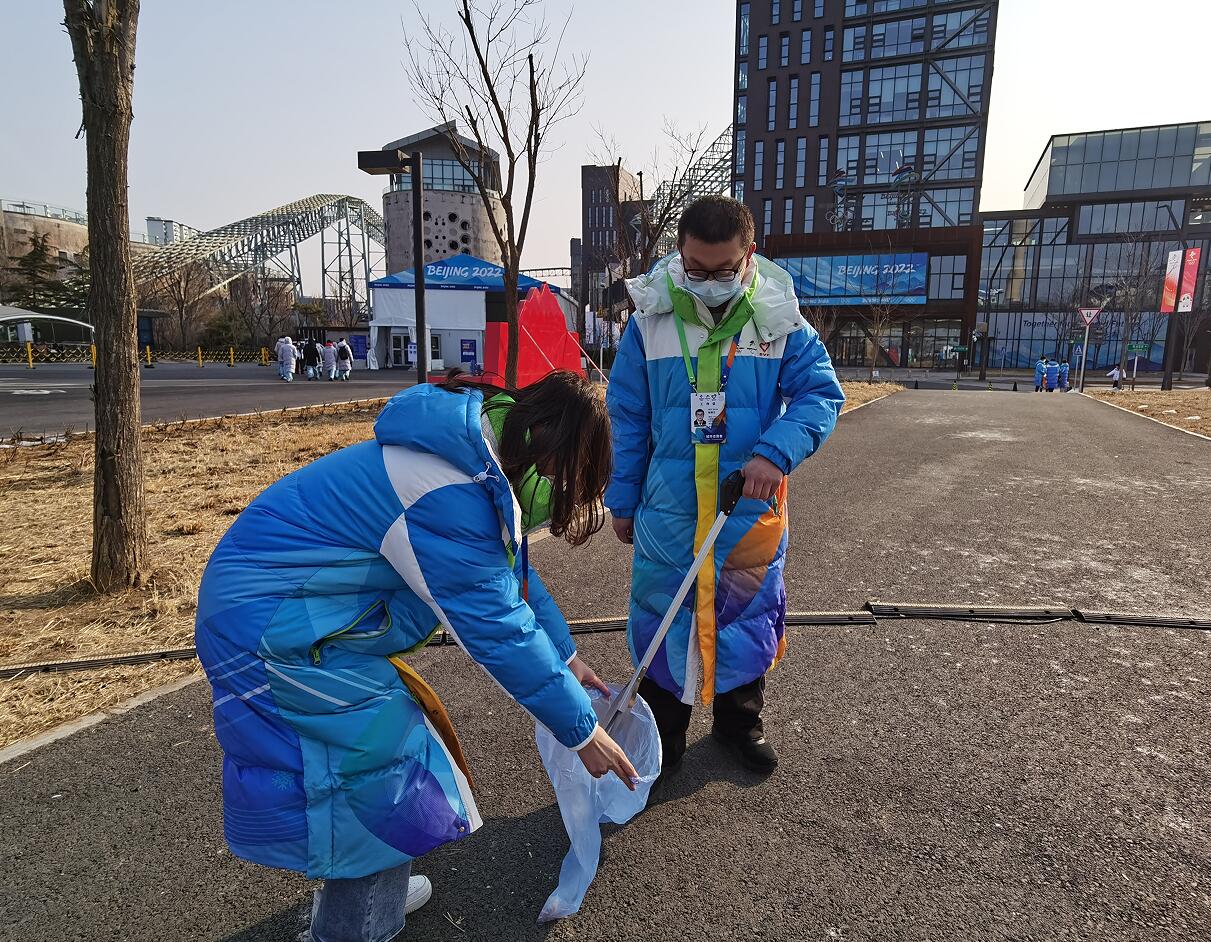 張睿娟與侯博文在冬奧組委總部附近拾撿垃圾,共同維護美好環(huán)境
