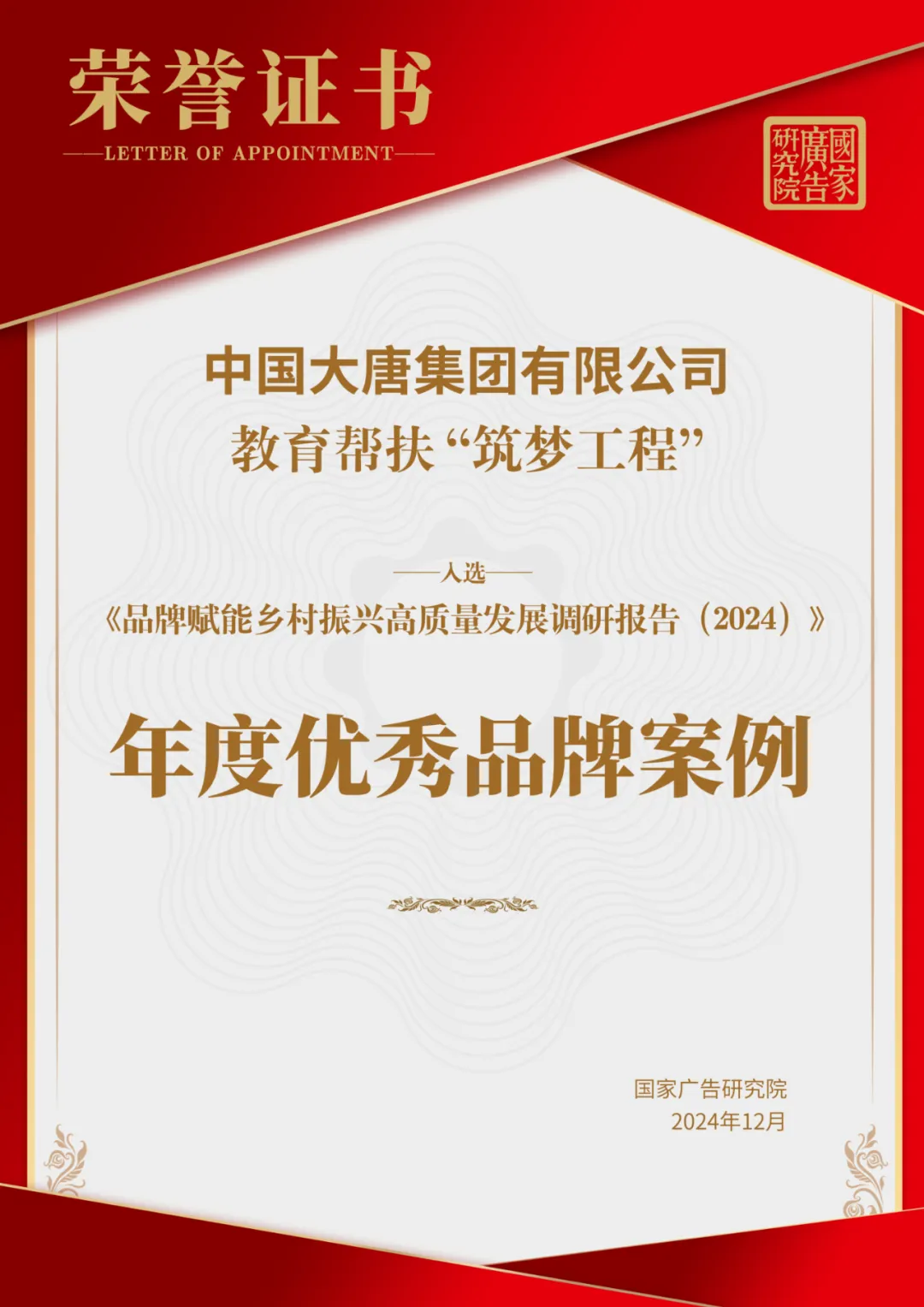 近日,由中國廣告協(xié)會指導(dǎo),國家廣告研究院與新華網(wǎng)鄉(xiāng)村振興研究院聯(lián)合主辦的《品牌賦能鄉(xiāng)村振興高質(zhì)量發(fā)展研究報告(2024)》發(fā)布暨鄉(xiāng)村振興品牌發(fā)展評價指標體系論證會在京舉行,會上發(fā)布了2024年度優(yōu)秀品牌案例。憑借在品牌賦能鄉(xiāng)村振興工作中的突出表現(xiàn),《中國大唐教育幫扶“筑夢工程”》入選年度優(yōu)秀品牌案例。